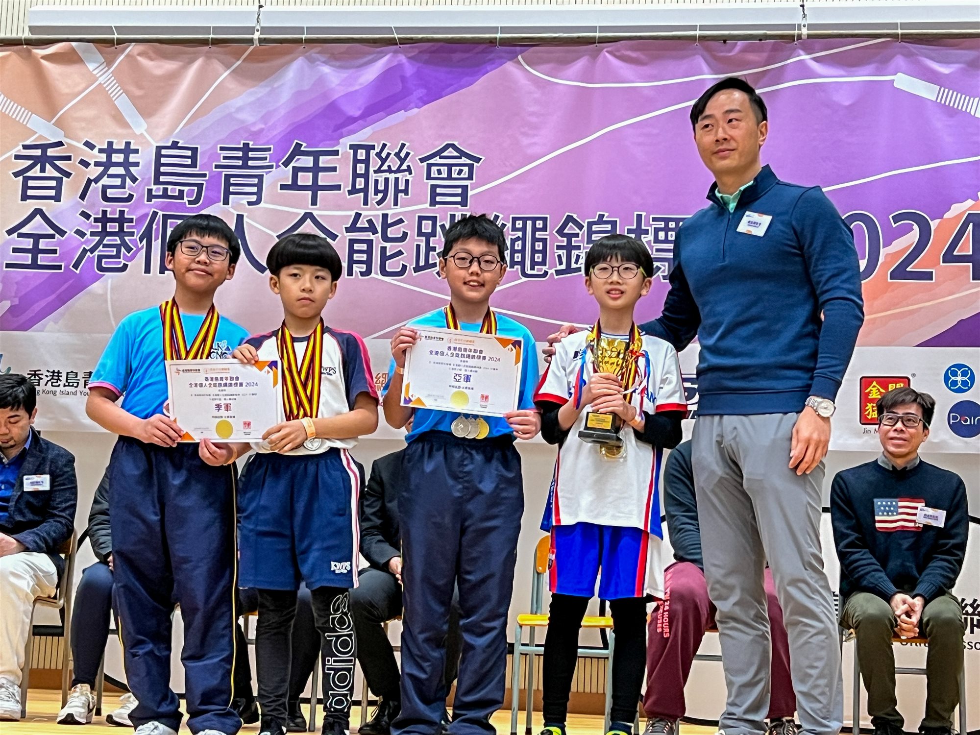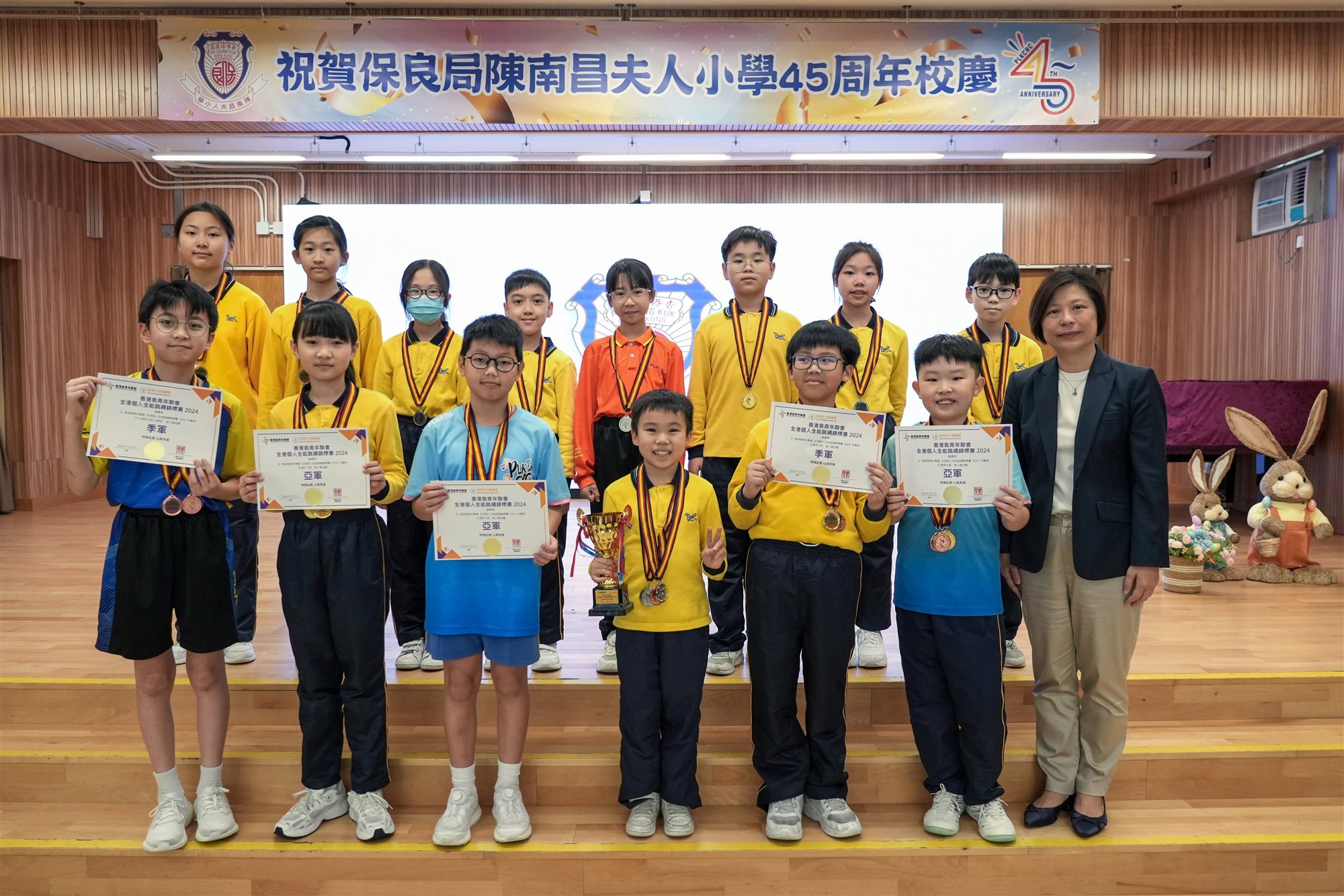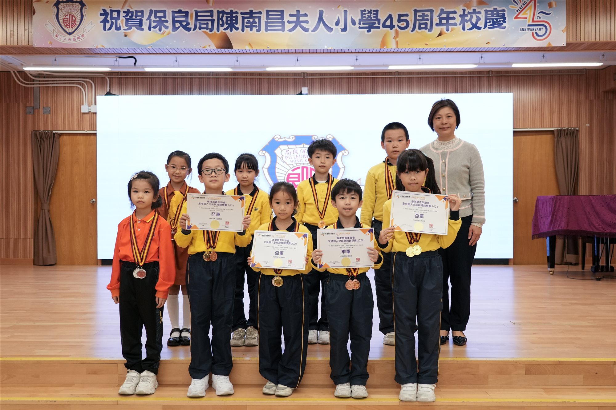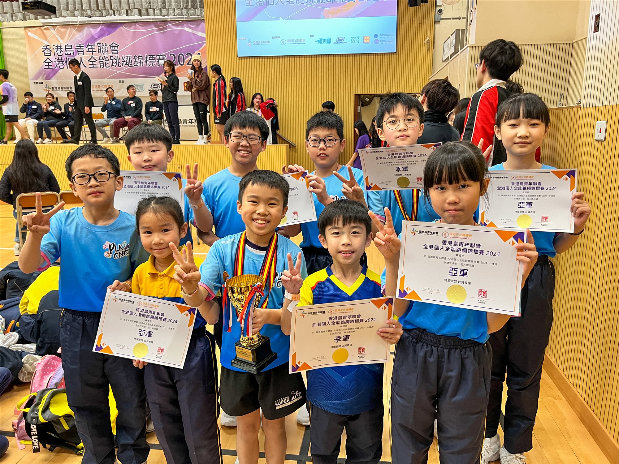 本校花式跳繩組於2024年3月3日參加由香港島青年聯會主辦之「全港個人全能跳繩錦標賽2024」跳繩比賽。30位花式跳繩組同學共參加90項比賽,憑着努力不懈地練習,同學們在比賽中榮獲14項冠軍、14項亞軍及15項季軍。更在「一般組」個人總成績中榮獲6個亞軍及2個季軍。除以上個人榮譽外,在9-11歲男子「公開組」個人總成績中,更勇奪了冠軍及季軍。成績斐然!