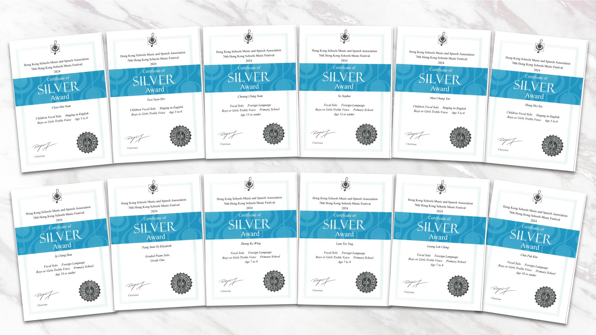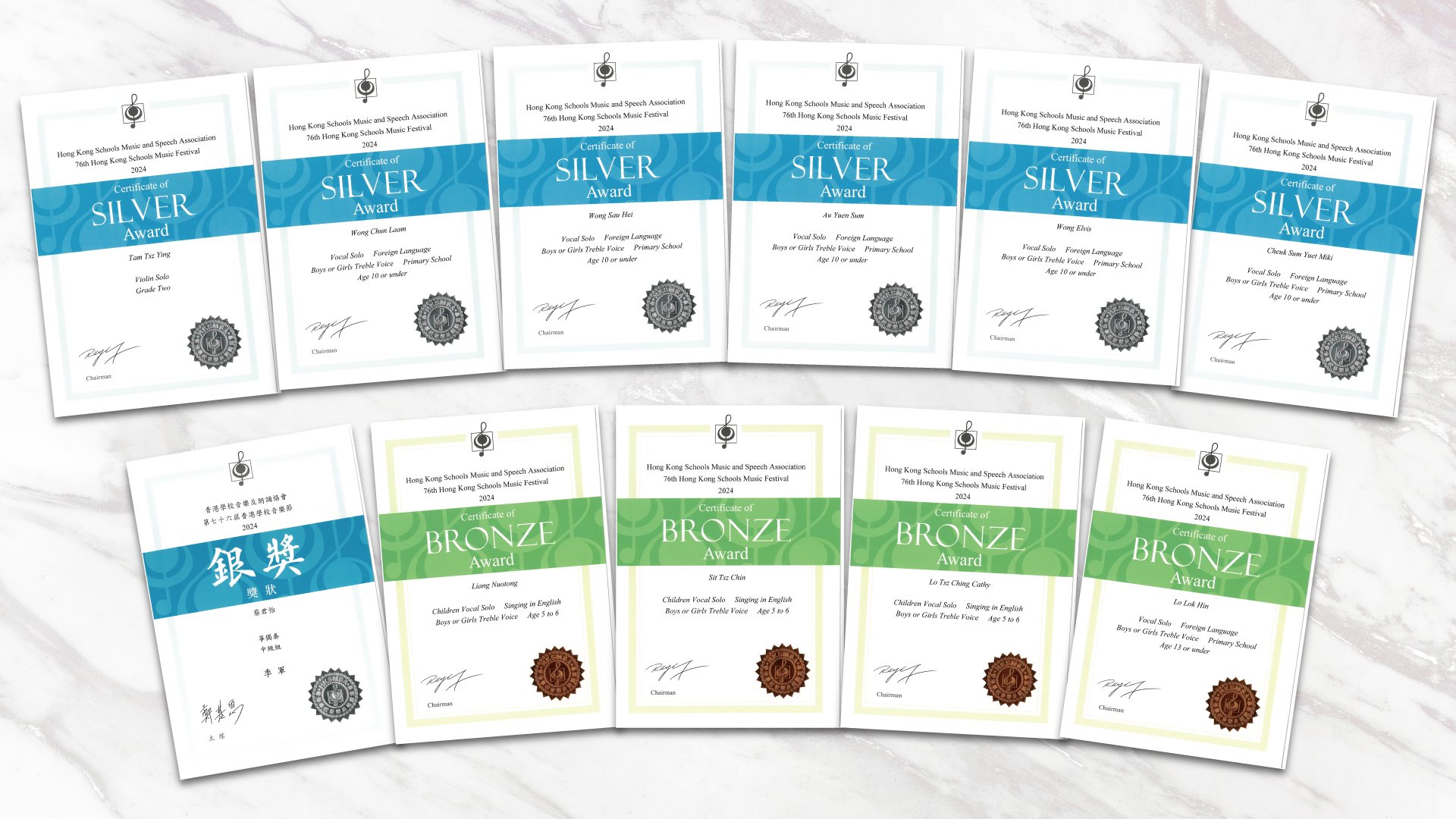 恭喜以上所有得獎同學於2024年第74屆香港學校音樂節及香港學校朗誦節中獲得銀獎獎狀、銅獎獎狀!
