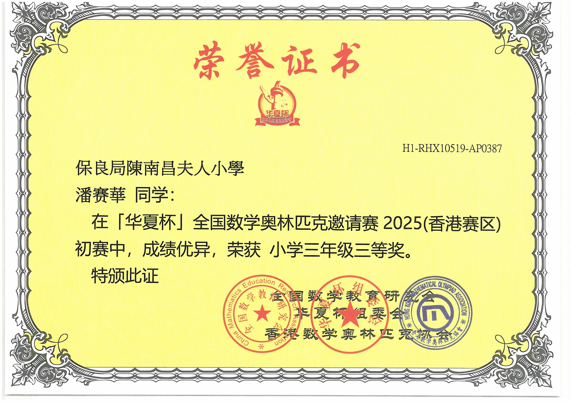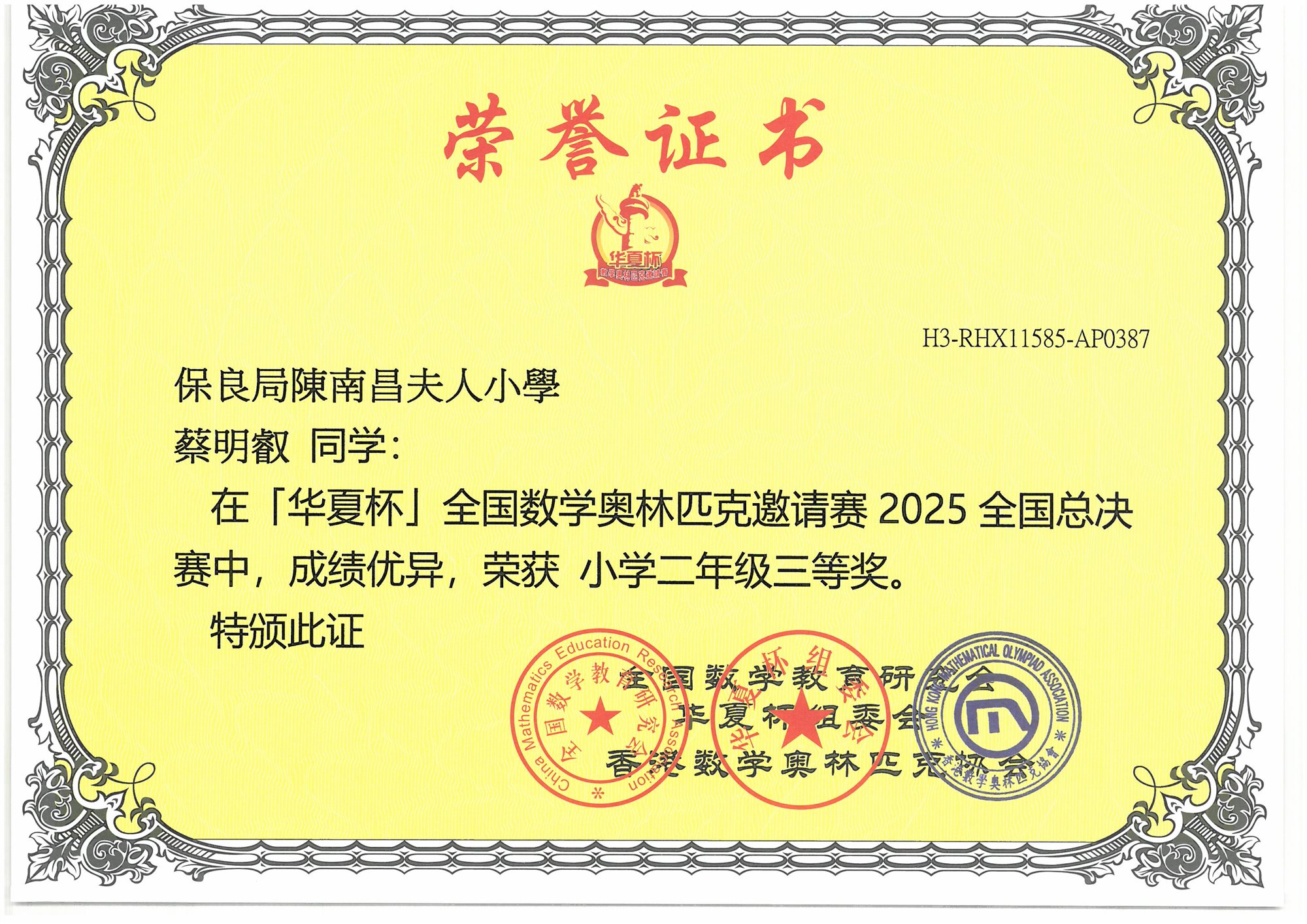 (香港賽區)初賽 小學三年級-三等奬