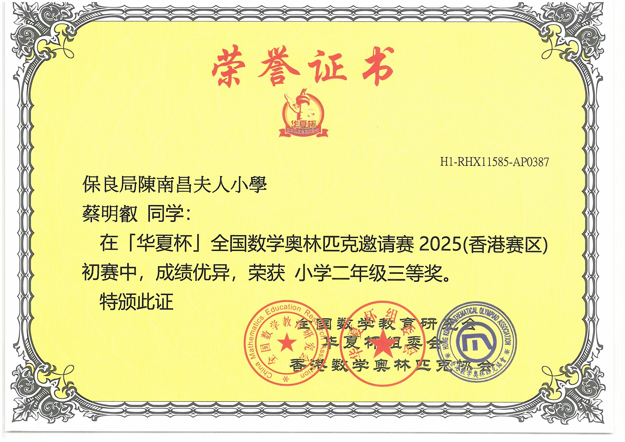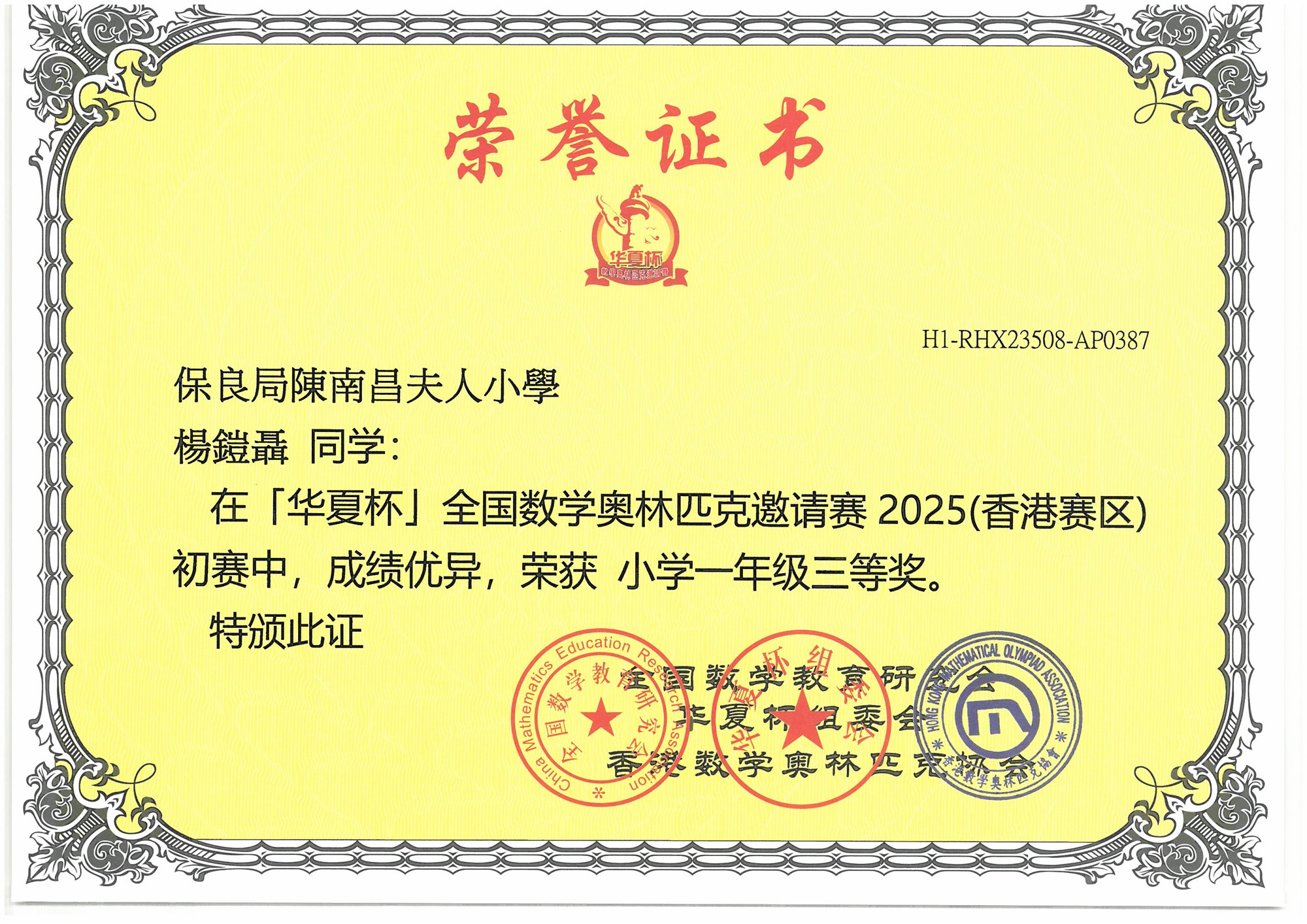 (香港賽區)初賽 小學一年級-三等奬