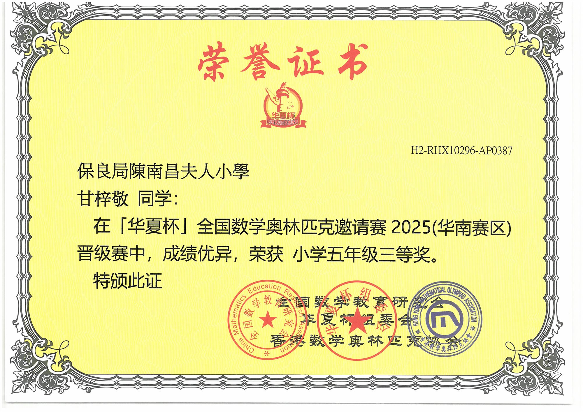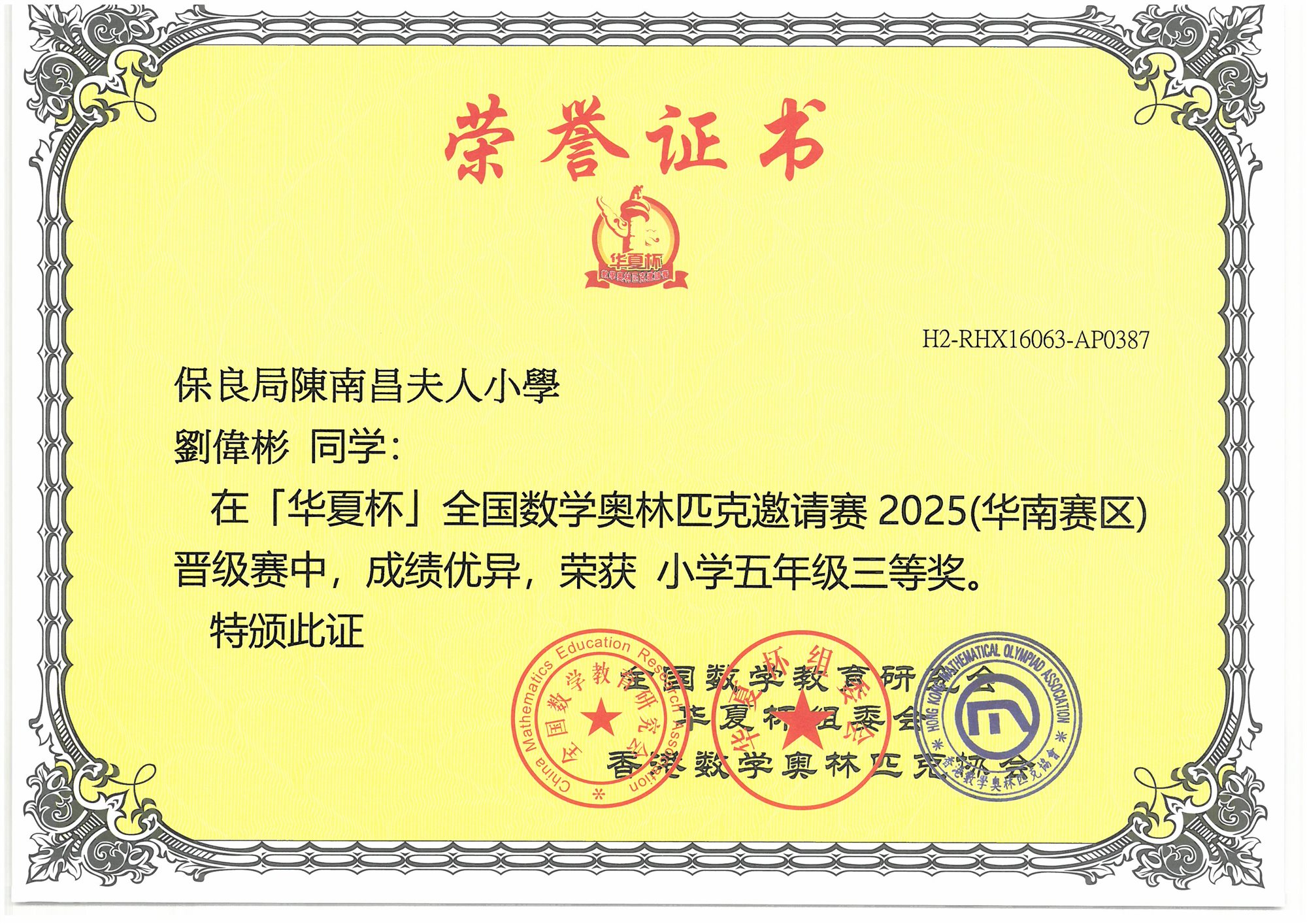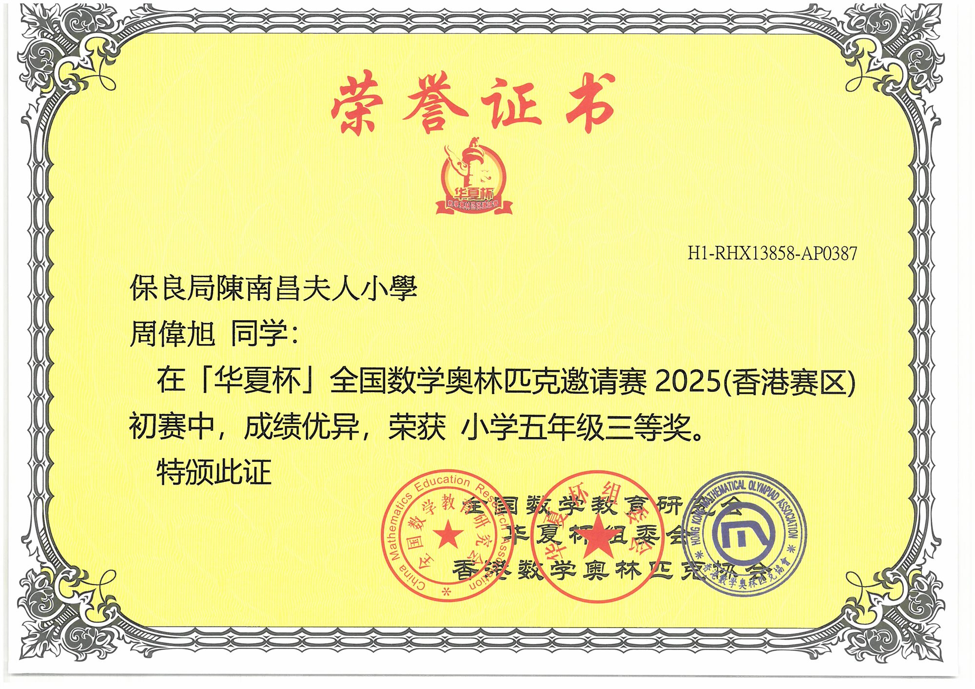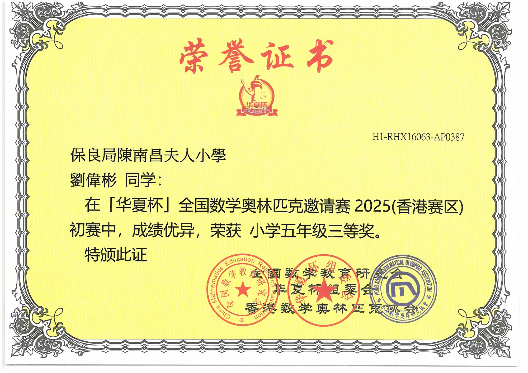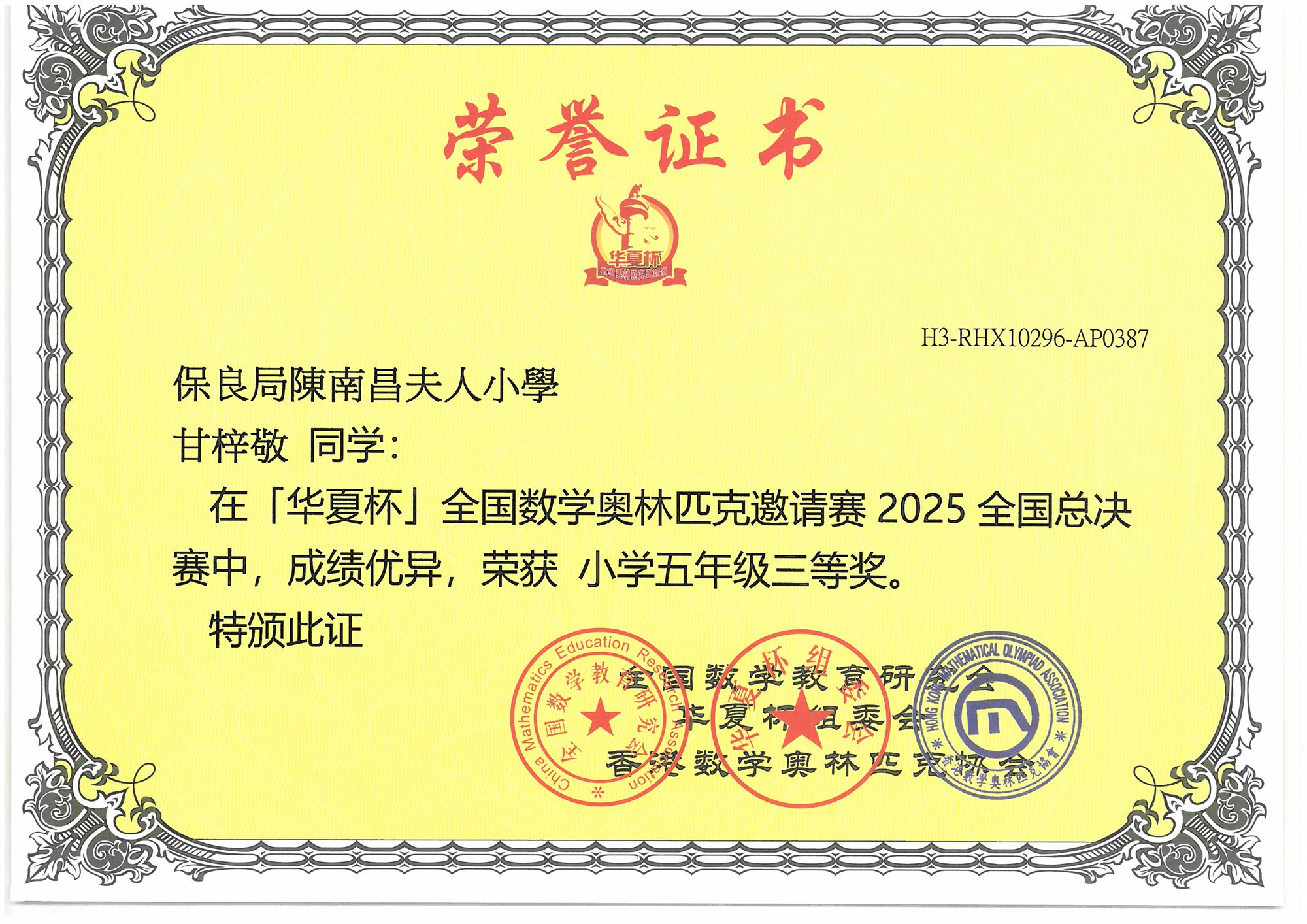 (香港賽區)初賽 小學五年級-三等奬