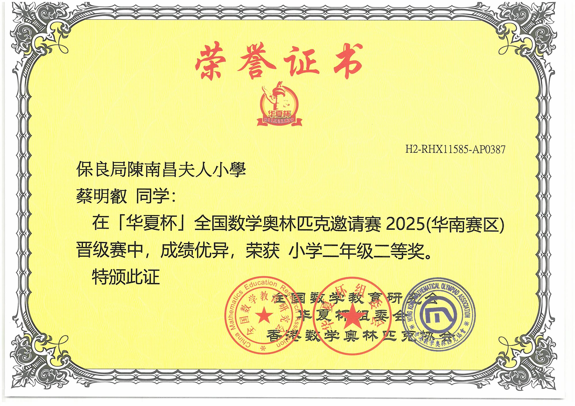 (香港賽區)初賽 小學二年級-三等奬